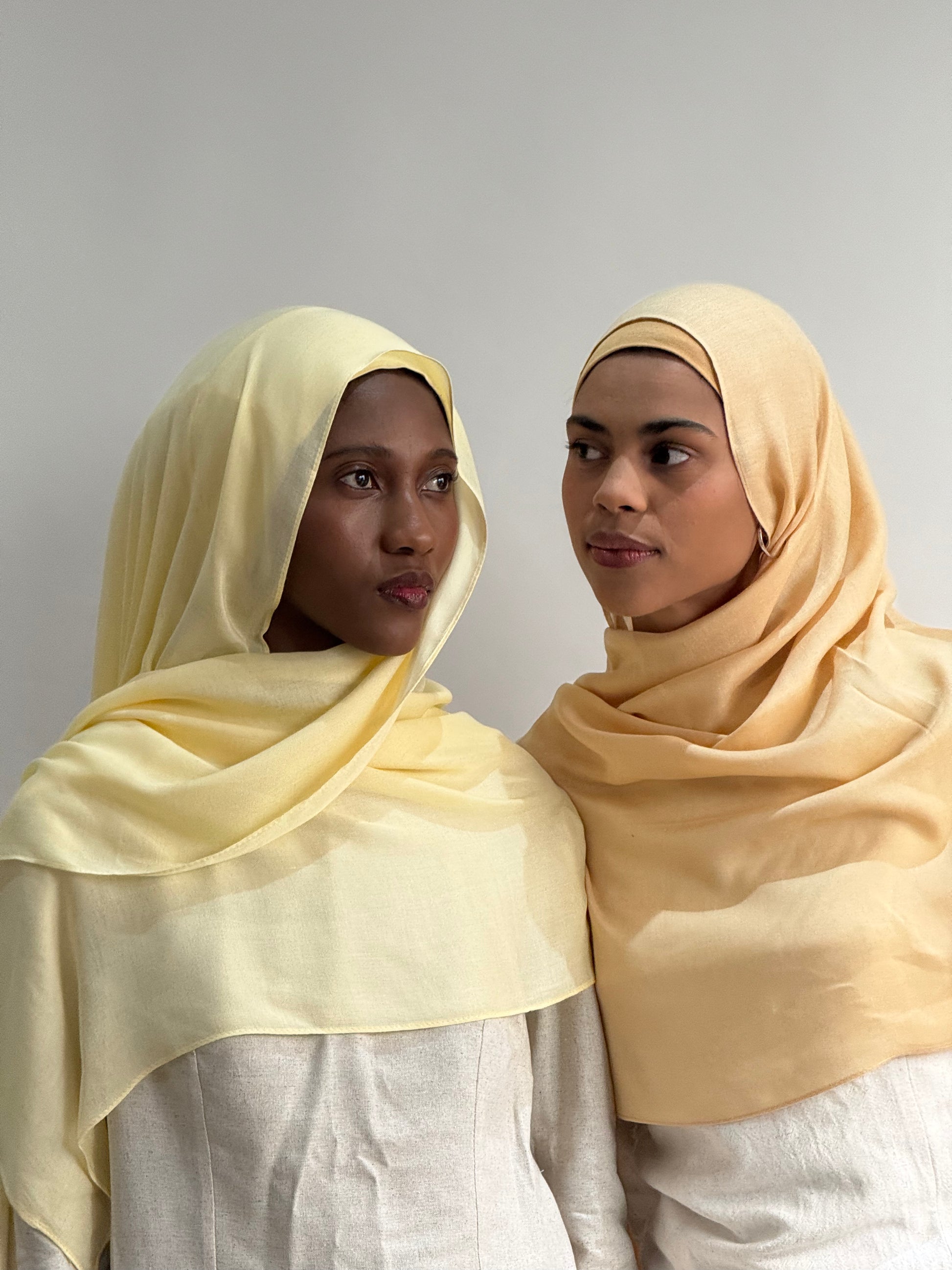 Made with our custom woven and custom dyed 100% Modal making it light weight and breathable, perfect for any season. Designed for comfort, elegance, and a seamless colour match between scarf and under-cap.