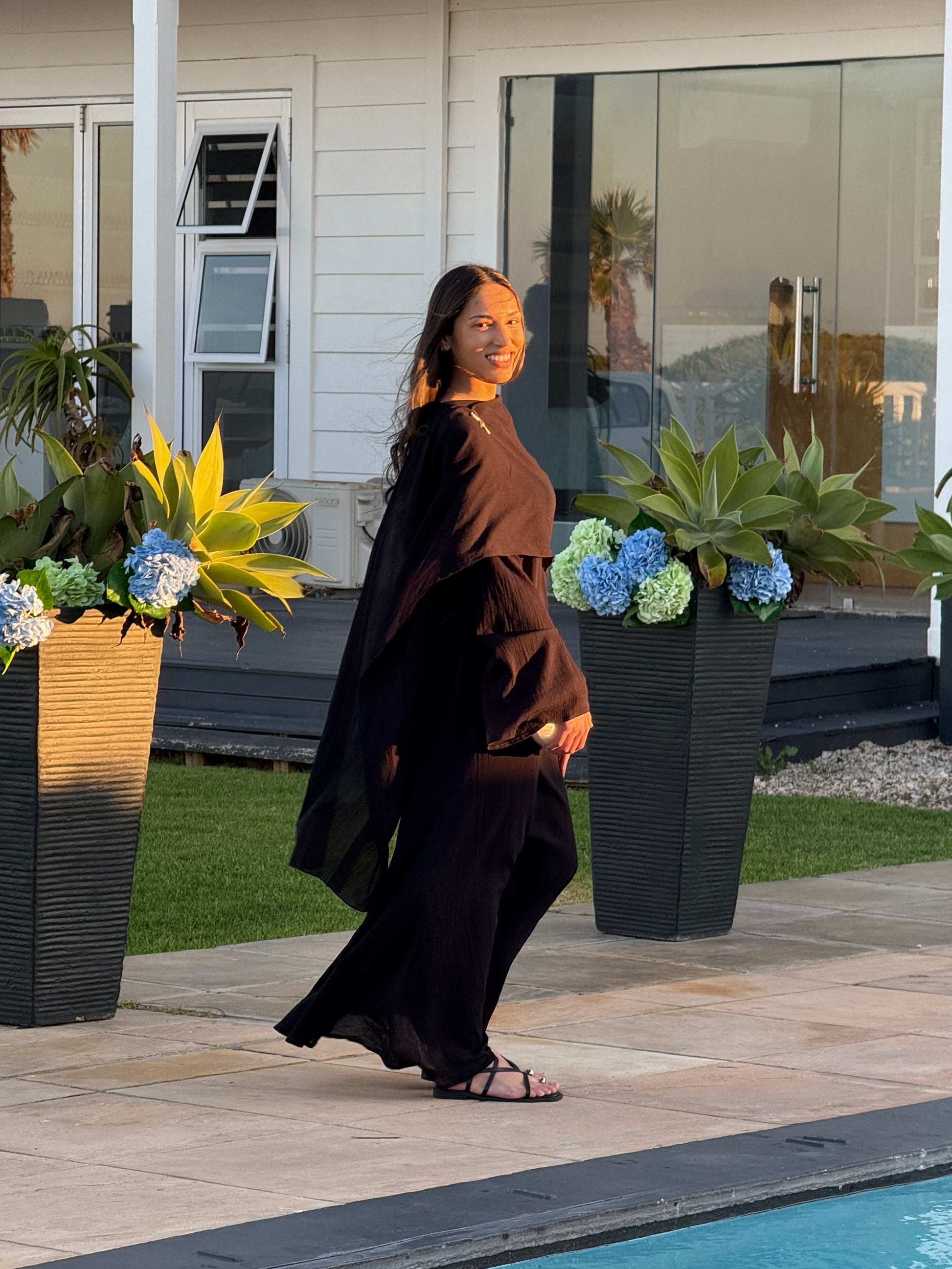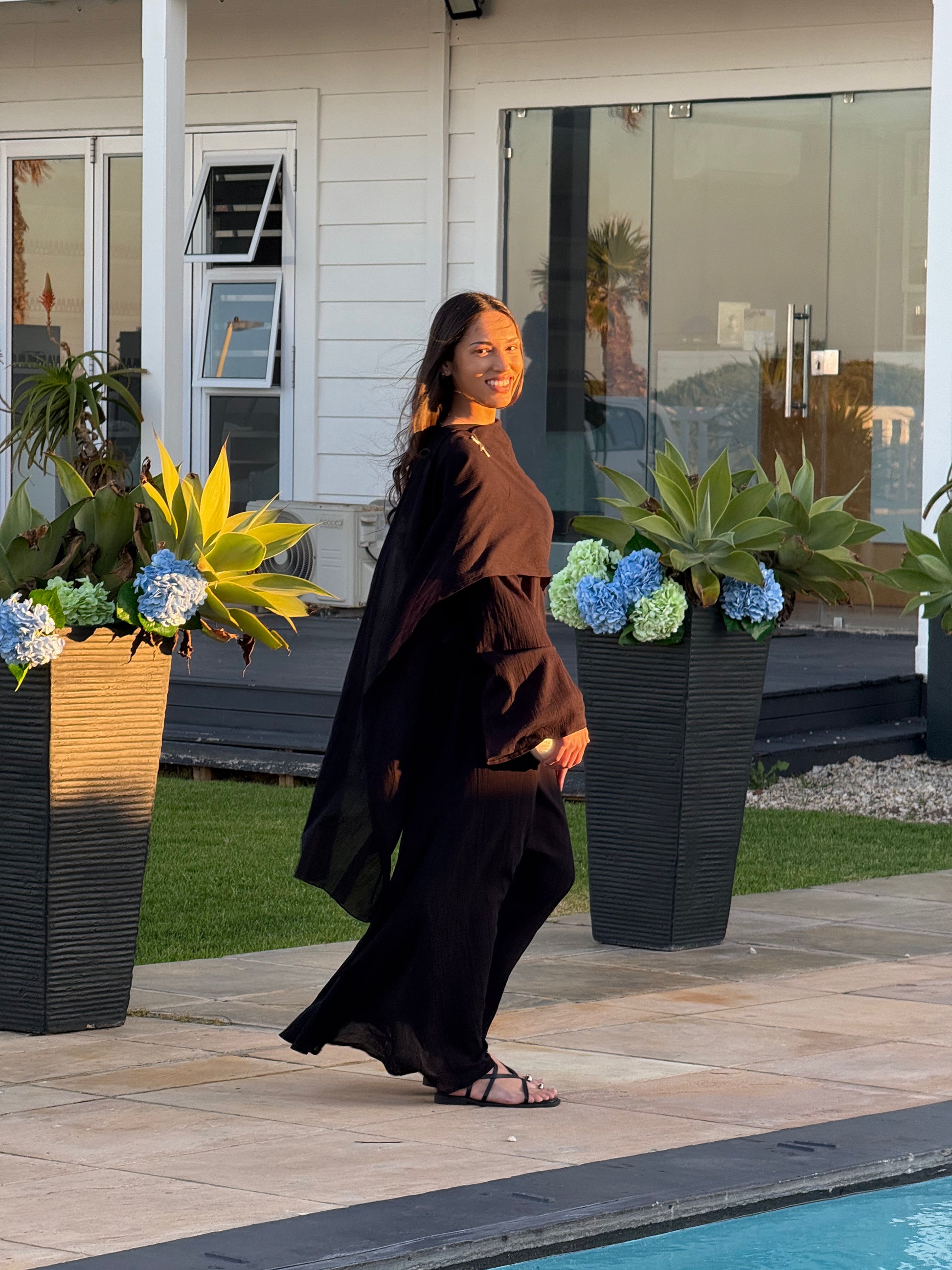 Inspired by the effortless charm of our most loved Sahara Set, the new Sahara Dress transforms its essence into a flowing, full-length silhouette. The signature draped detail remains, now seamlessly integrated into a design that moves with ease. Crafted from textured satin with a ripple effect, its surface mirrors the shifting dunes, capturing the quiet grandeur of the desert. A piece where simplicity meets statement.