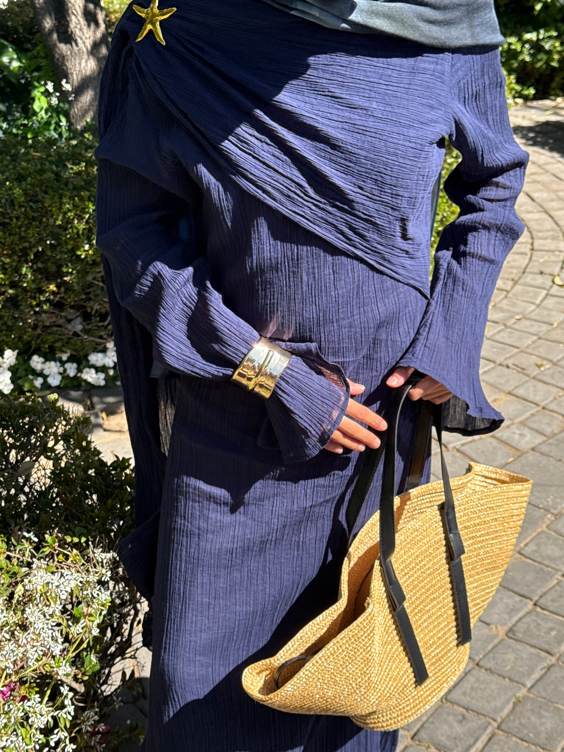 Inspired by the effortless charm of our most loved Sahara Set, the new Sahara Dress transforms its essence into a flowing, full-length silhouette. The signature draped detail remains, now seamlessly integrated into a design that moves with ease. Crafted from textured cotton with a ripple effect, its surface mirrors the shifting dunes, capturing the quiet grandeur of the desert. A piece where simplicity meets statement.