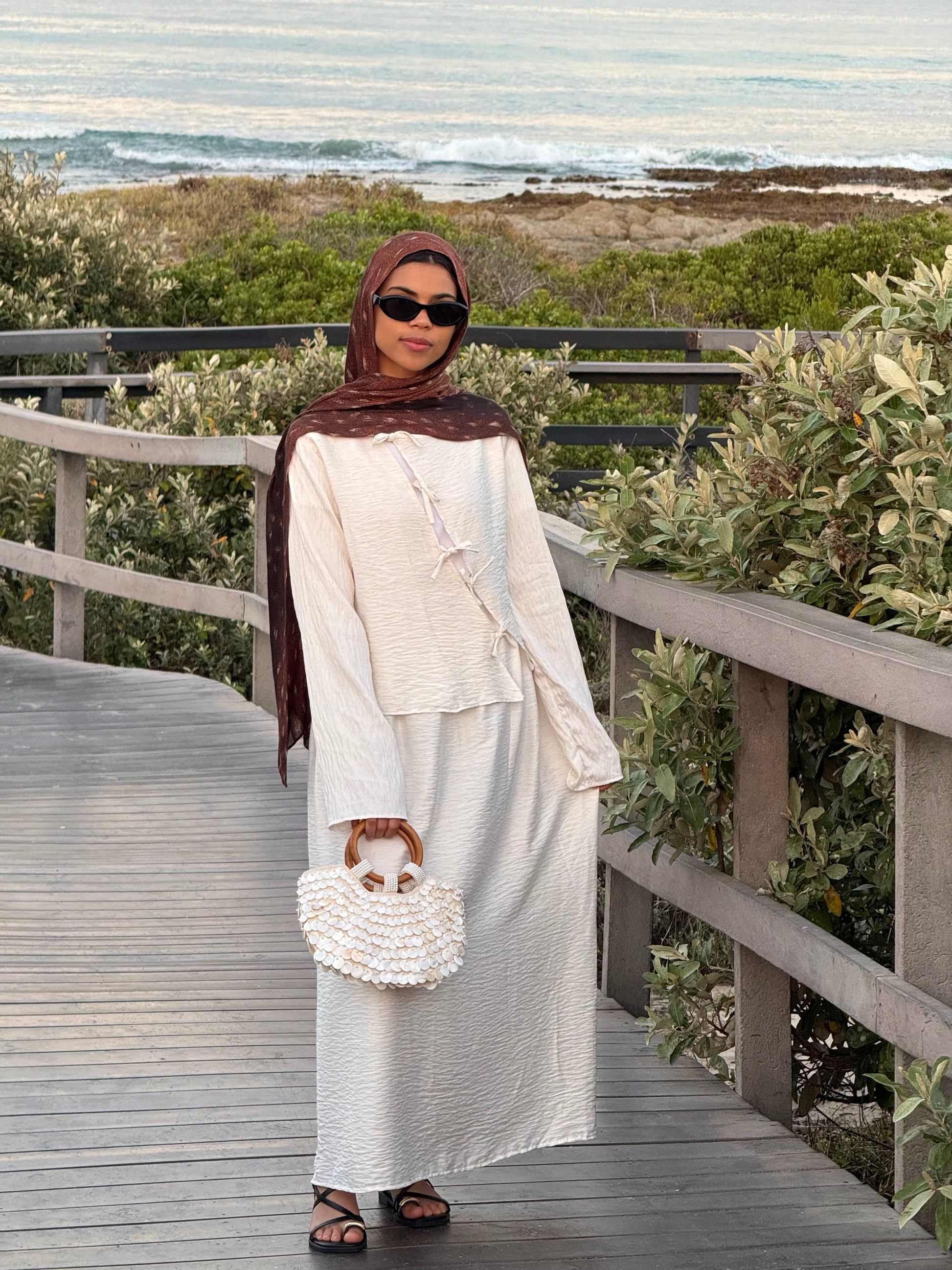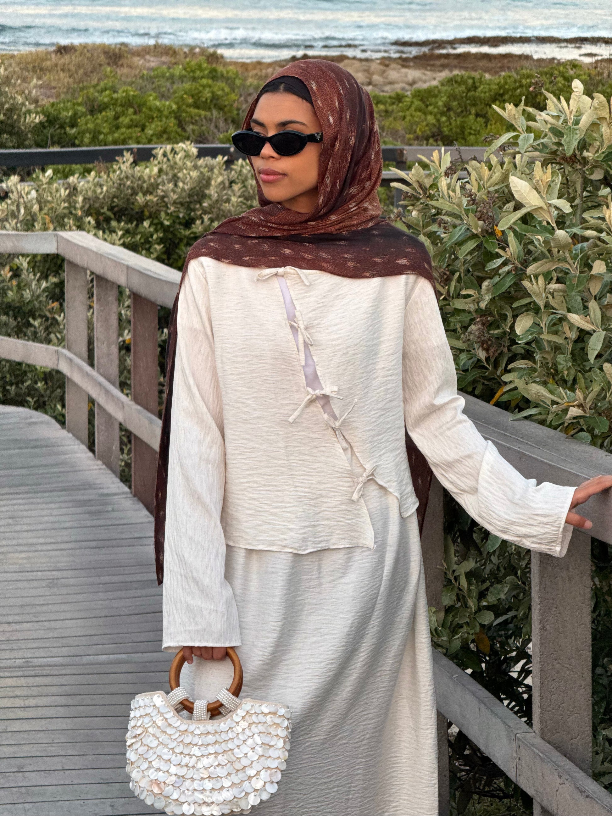The Zara Top is an easy-going asymmetrical tie top designed for relaxed, everyday wear. Featuring a soft drape and adjustable front ties, it offers a customizable fit while maintaining a fluid, effortless silhouette. Simple, versatile, and endlessly wearable.